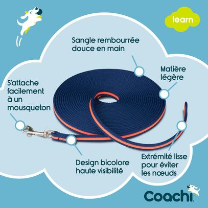 Souple, pratique et sécurisante, la longe Coachi est l’alliée idéale pour l’éducation, la socialisation et le jeu en toute sérénité.